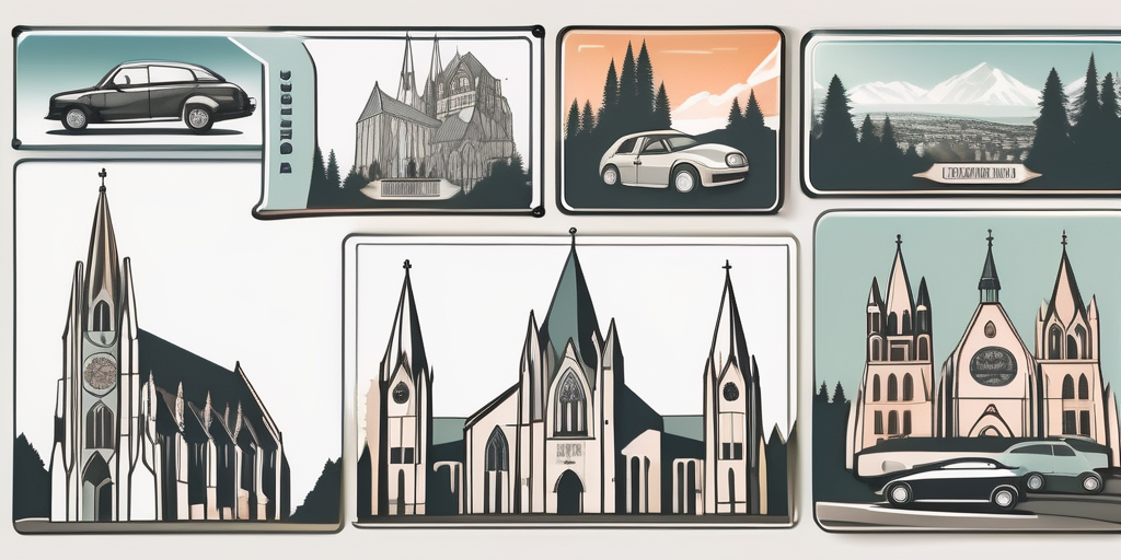 A variety of car license plates scattered across a backdrop of bergisch gladbach's notable landmarks