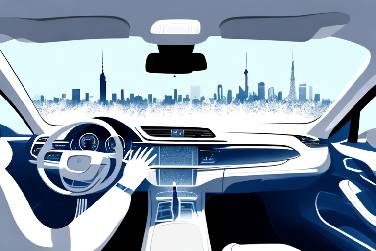 An immaculately clean and shiny car interior with frankfurt's skyline visible through the car windows