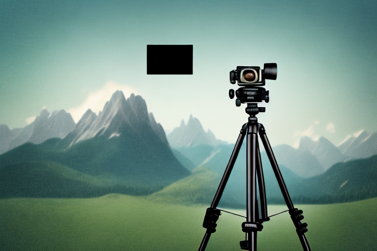 A camera on a tripod with a beautiful landscape in the background