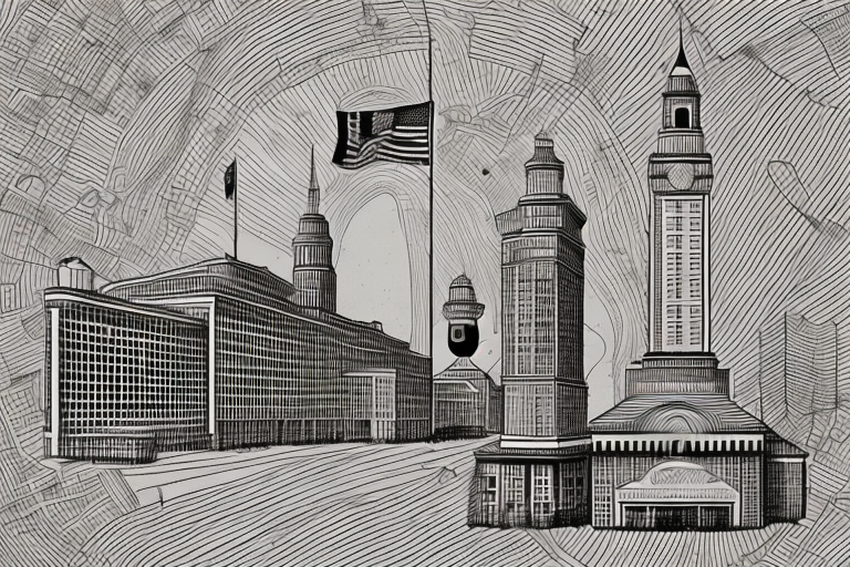 An old-fashioned camera with a collection of black and white photographs depicting various historical landmarks and events